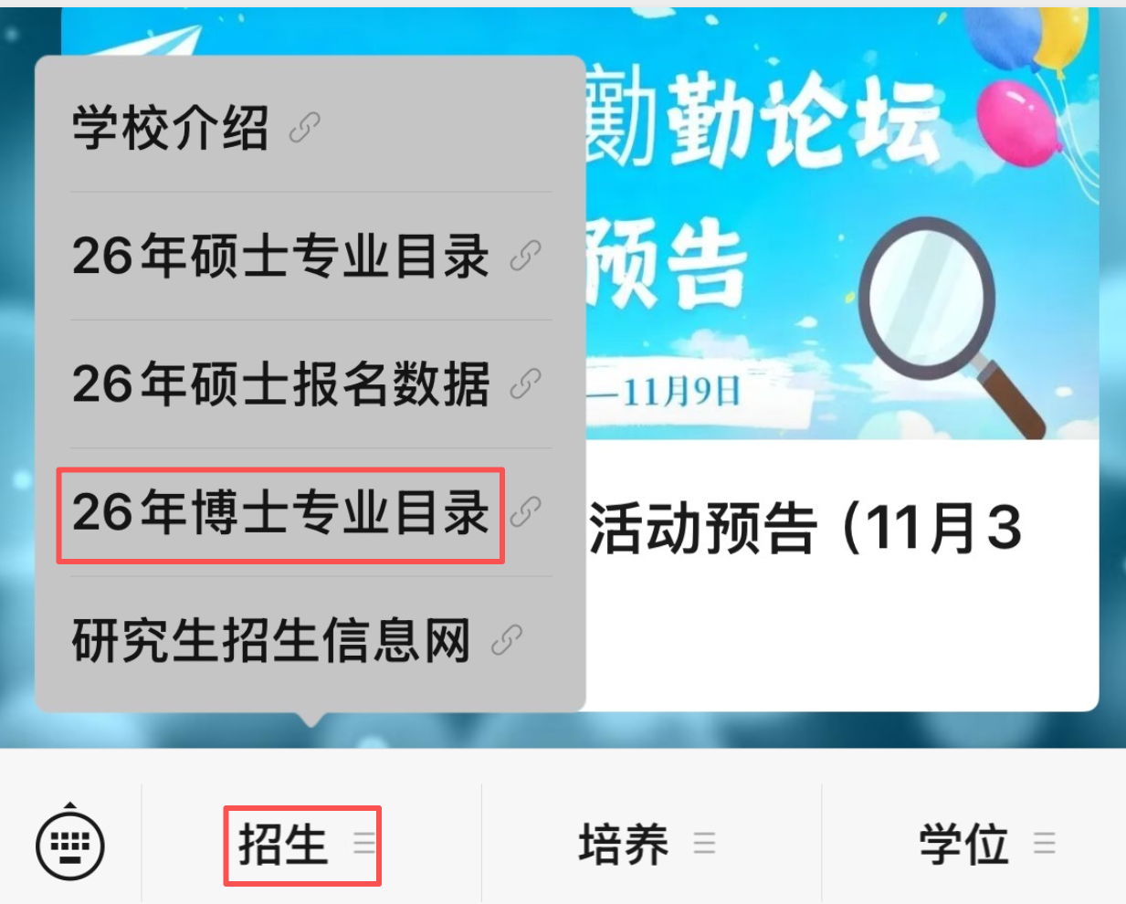 依次:关注公众号--点击【发消息】--点击左下角【招生】,如下图所示: